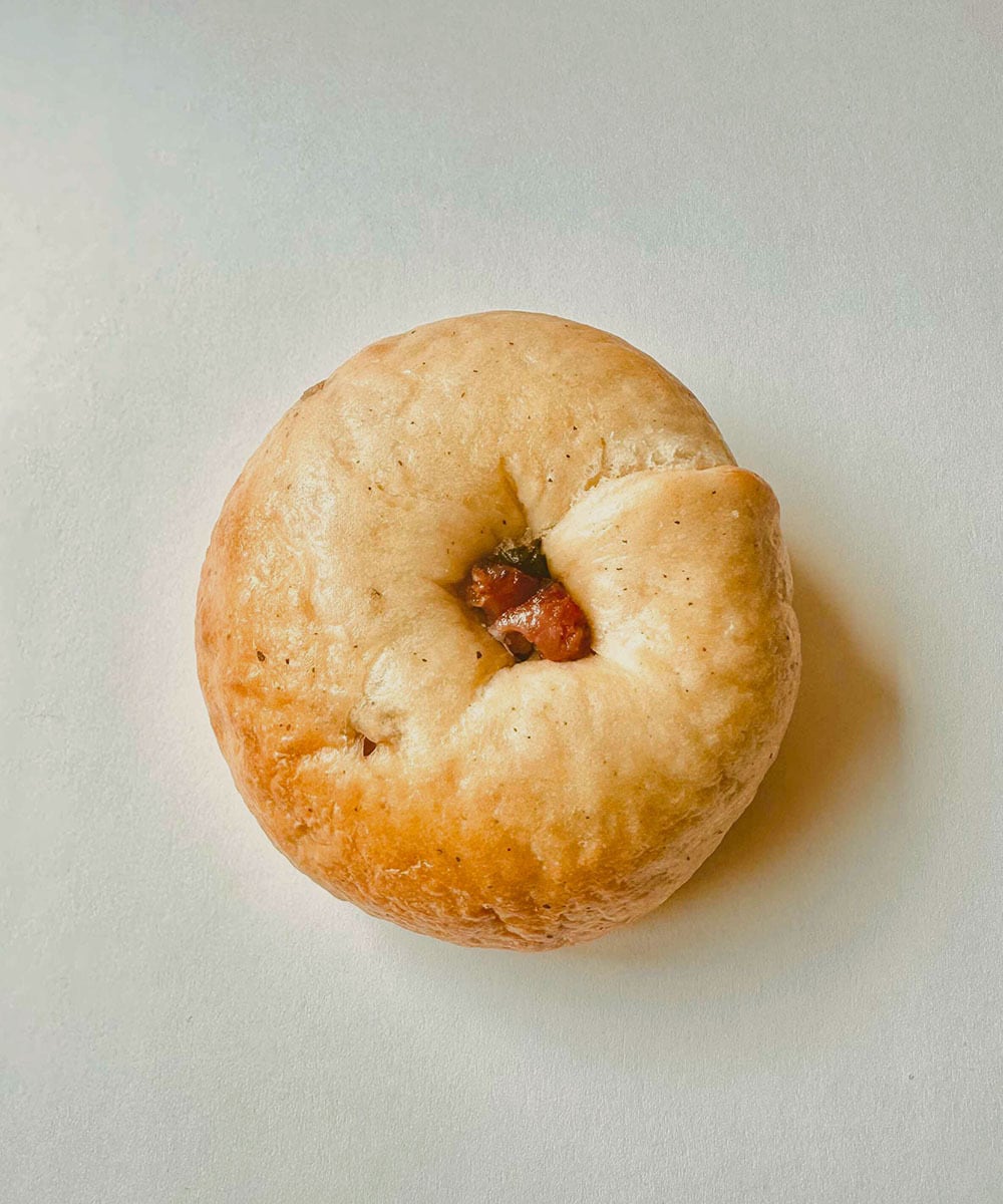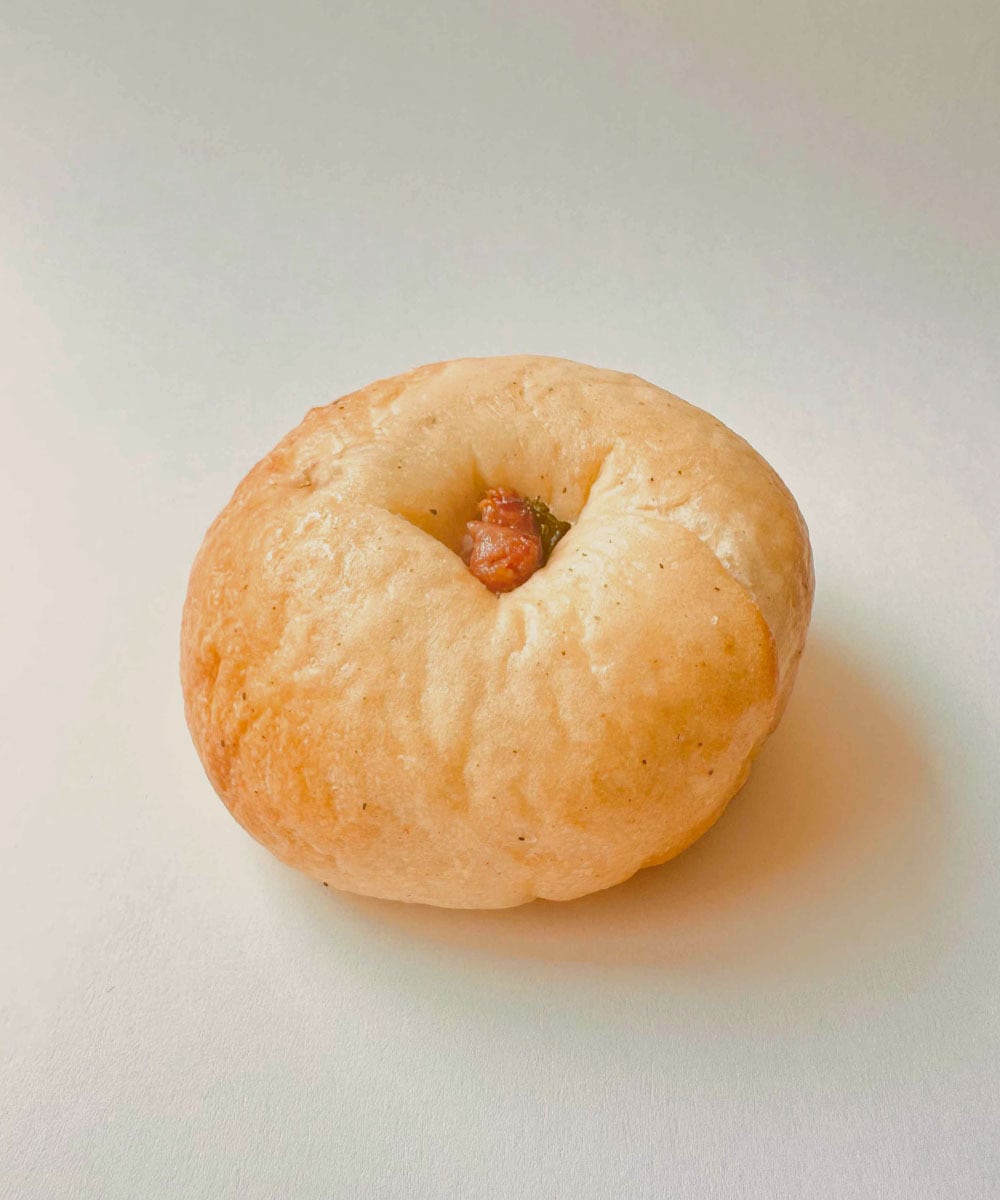 甘みのある台湾ソーセージを香ばしく炒め、にんにくとねぎの風味を合わせて包みました。食欲をそそる香りが広がる、満足感のあるお食事系ベーグルです。軽くトーストすると、より一層美味しくお召し上がりいただけます。